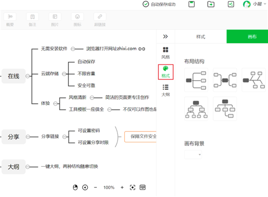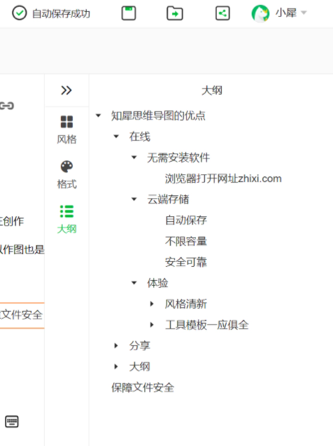 知犀思维导图会自动生成大纲,点击大纲即可预览。大纲内容与思维导图实时同步,并且还可以直接对大纲进行修改。