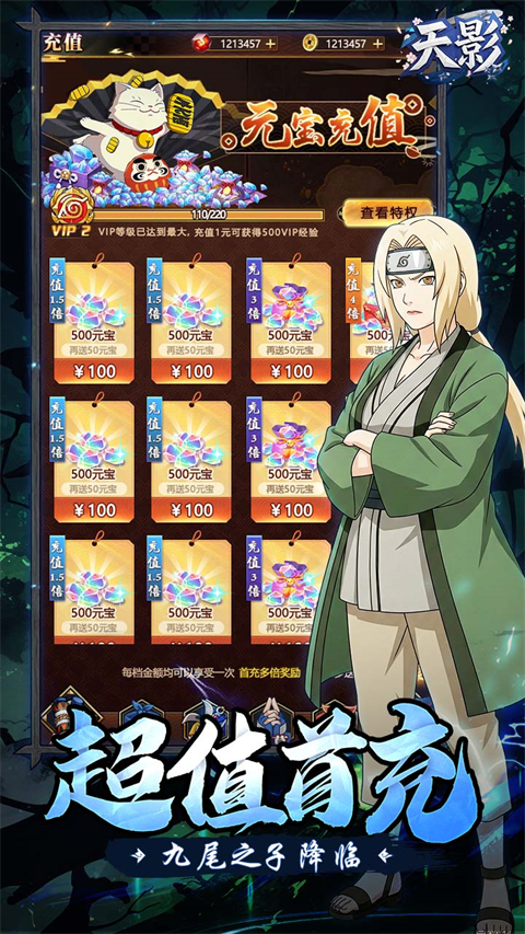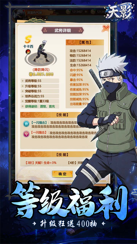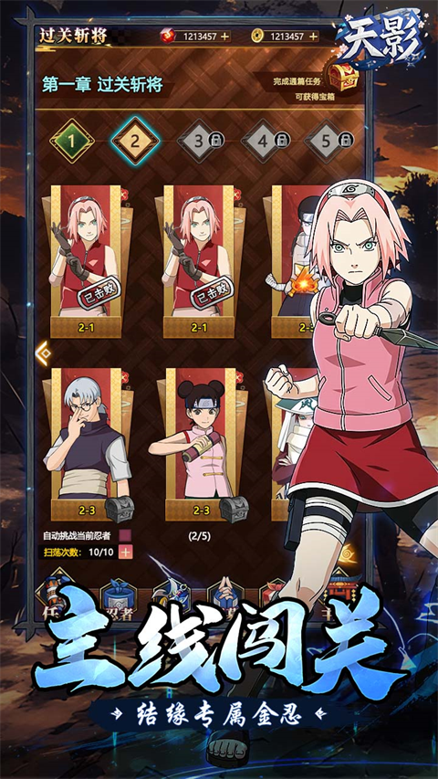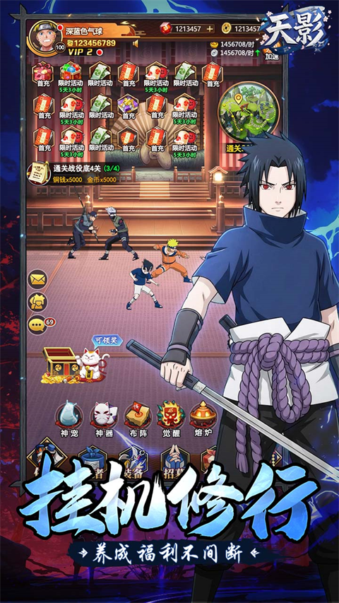 天影是一款以经典动漫《火影忍者》为题材的卡牌战斗手游,不仅高度还原了火影世界的经典角色与剧情,更提供了海量丰富的忍者角色,玩家可以招募并培养喜欢的忍者,组建专属于自己的火影小队,与他们并肩征战整个忍者世界。同时,为了让玩家更轻松地享受游戏,天影游戏内还引入了挂机系统,让玩家在离线状态下也能获得经验和奖励。感兴趣的小伙伴快来下载体验吧~