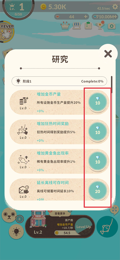 5、当金币足够多时,可以使用金币对已解锁的房屋进行等级升级