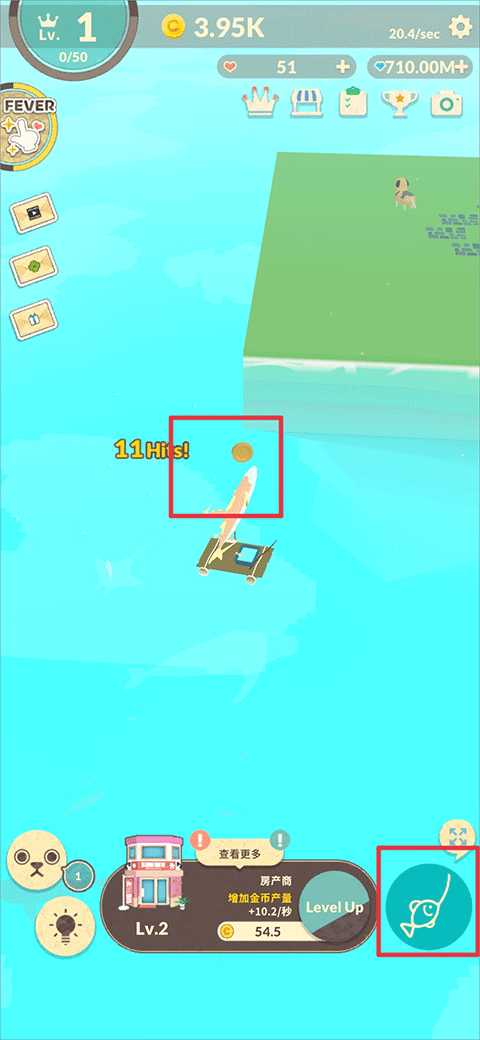 3、想要将小岛发展到越大,金币是必不可少的,玩家通过一直点击右下角钓鱼按钮即可获得丰富金币奖励