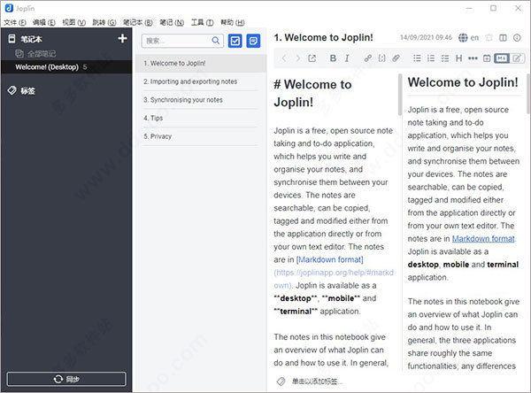 joplin中文版是一款非常有用的工具型笔记软件,可以轻松处理组织到笔记本中的大量笔记,且其笔记的的书写格式是Markdown,非常简单和容易上手,可以直接从应用程序或您自己的文本编辑器中复制、标记和修改。另外,它虽然是国外的开源软件,可国人不用担心看不懂的问题,完全支持简体中文,能够更方便于进行使用,个人记笔记使用完全是绰绰有余的,其笔记分享和多人协作的功能现在社区正在开发之中。由于joplin是免费软件,所以没有自己的同步服务器,但能够支持使用OneDrive、Dropbox、WebDav进行同步,非常的方便实用。同时,相较于较有名的印象笔记来说,该软件无需面临数据存储隐私问题,所有数据可以完全掌握在自己手中,经过不断迭代,而且界面也已经非常靓丽,值得大家一试。下文奉上的了joplin软件详细的使用图文教程,其中包含了如何设置中文以及同步设置,有需要的小伙伴们不妨前来下载一试。