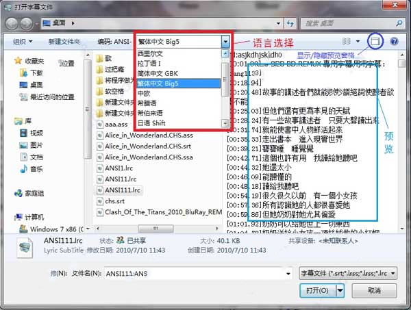 SrtEdit能自动识别非当前 Windiows 语言的 ANSI 字幕(例如在简体中文 Windows 下打开了 Big5 编码的字幕文件)的语言代码页,会正常显示。如果出现乱码,说明自动识别失败,可能是因为字幕文本内容太少,可通过主菜单或工具栏中的【打开字幕】选项。