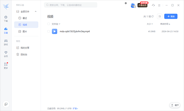 1、用户进入迅雷云盘pc客户端界面后即可点击右侧的【添加】,然后进行文件的上传或从网上将文件下载到网盘里