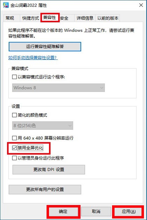 2、在属性页面中点击兼容性,在兼容性页面中把禁止全屏优化的选项打上勾,再点击右下角的应用,最后点确定就行了