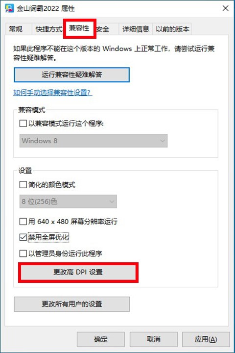 1、前面跟着上面的方法,先进入兼容性页面,然后鼠标左击更改更高DPI设置的窗口