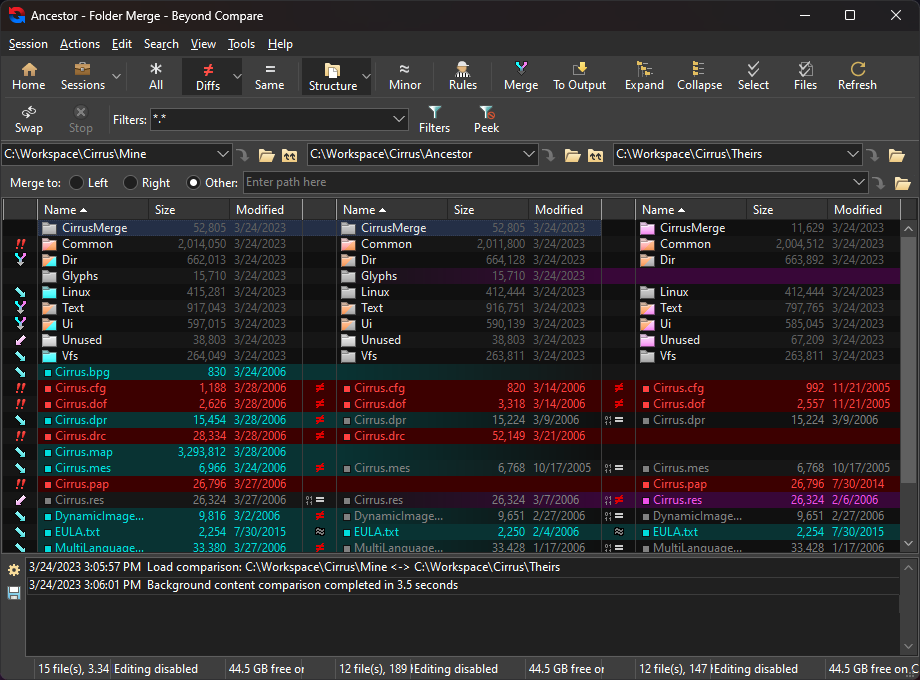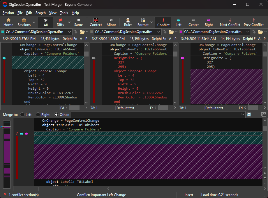 Beyond Compare 的合并视图允许您将文件或文件夹的两个版本的更改合并到单个输出中。其智能方法使您能够快速接受大多数更改,同时仔细检查冲突。