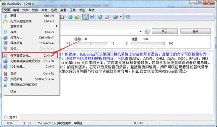 3、接下来,调试完成了,就点击balabolka菜单栏“文件”中的“保存音频文档”。