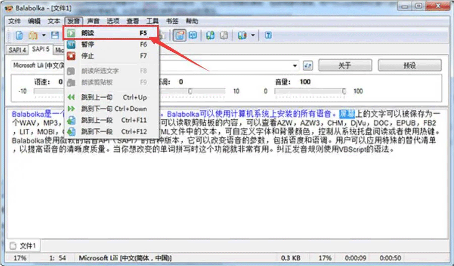 2、设置完成,点击balabolka菜单栏“发音”中的“朗读”,便可以试听语音效果。用户根据自己想要的听觉效果,调试语速、语调、音量。