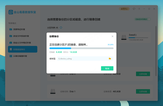 ③ 当U盘已经无法正常读取,系统提示损坏的磁盘无法访问,丢失了分区盘符时,可尝试创建磁盘备份,尽量减少额外的读写对原始数据造成破坏,如果是电脑中的分区提示损坏,建议将备份文件保存到外置移动硬盘或大容量U盘中,防止覆盖原有数据;