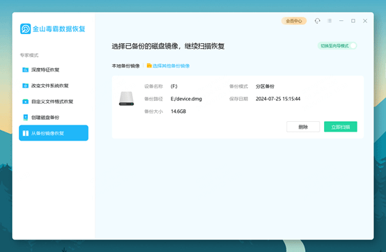 ④ 当备份完成后,在从备份镜像恢复中,可查看已备份的磁盘或分区,进行扫描恢复;