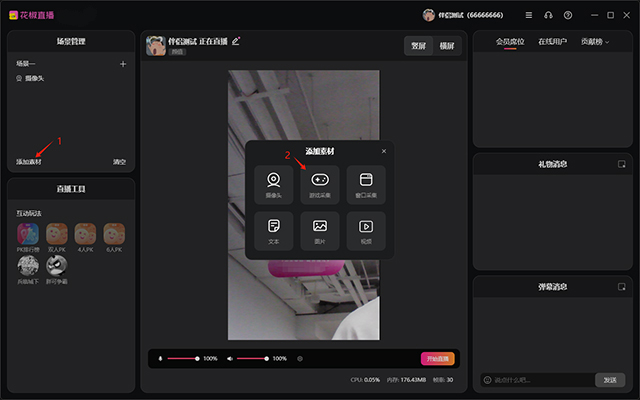 启动游戏后,点击“添加素材”打开“添加素材面板”并点击“游戏采集”
