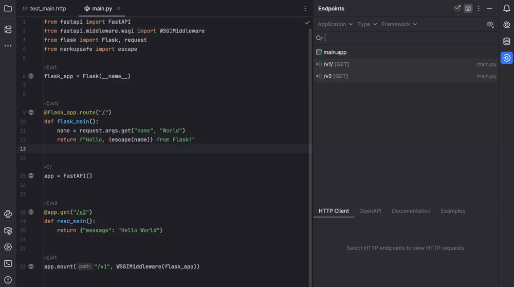 Endpoints(端点)工具窗口现在支持 FastAPI 中挂载的应用,包括 Django 和 Flask 应用。 挂载的路由会被检出并在 Endpoints(端点)工具窗口中显示,带有正确的路径前缀,使多应用项目更易管理。