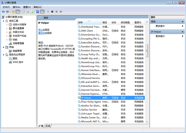 1、右键“我的电脑”-“管理”,在左侧边栏找到“服务”然后双击进入,在列表中找到“IP Helper”系统服务后,右键点击进入属性设置界面;
