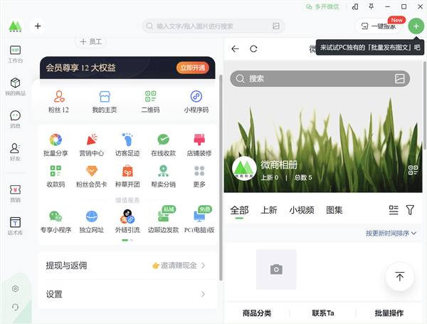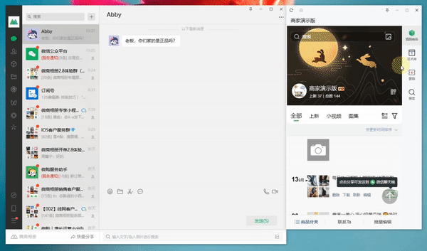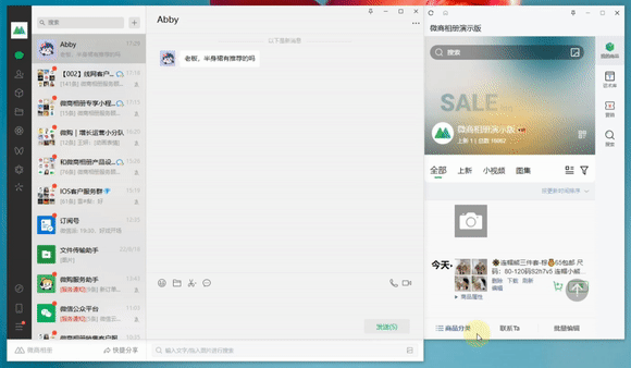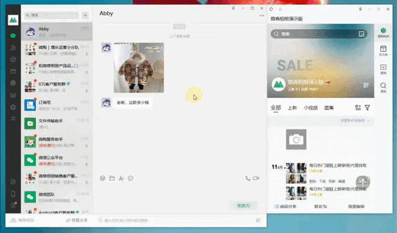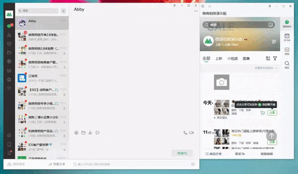 将微商相册挂件窗口移到微信界面右侧,窗口会自动吸附你的微信界面,方便你与客户聊天时,在微商相册同步进行搜索、分享等操作。此外,还支持与企业微信、QQ等聊天软件深度融合。
