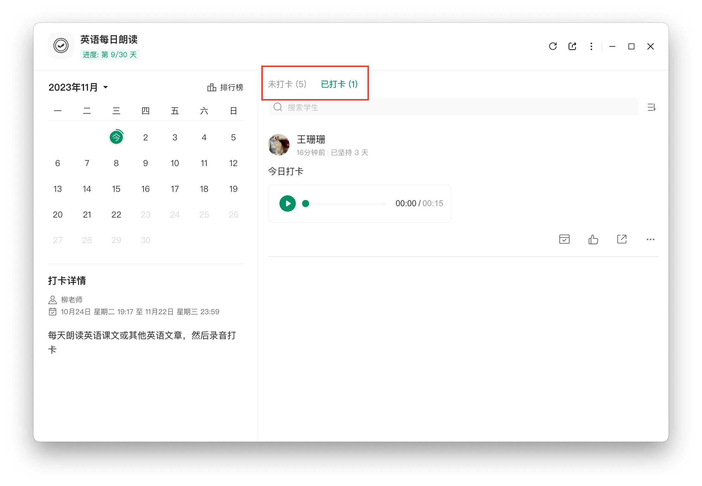 1.3 自动统计打卡数据,已打卡和未打卡名单一目了然,方便教师跟进学生打卡情况;