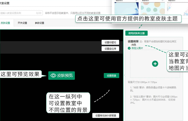 2、进入后你可以选择使用官方提供的教室皮肤,也可以使用纯色或自定义图片当教室背景