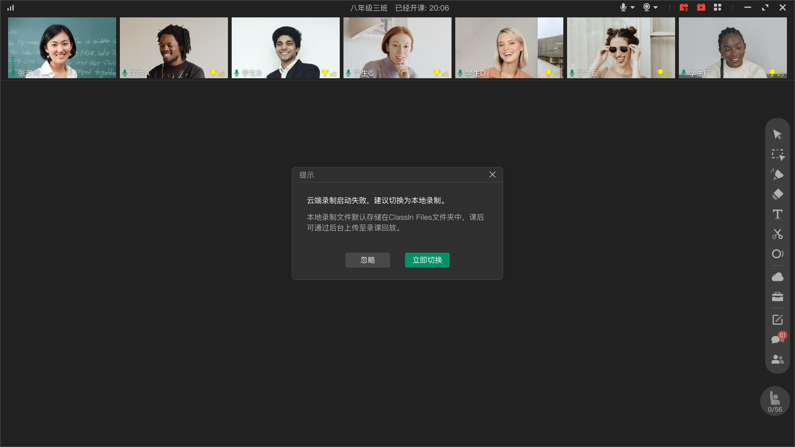 云端录课失败后,教师可手动切换为本地录制,尽可能保留课程视频内容。