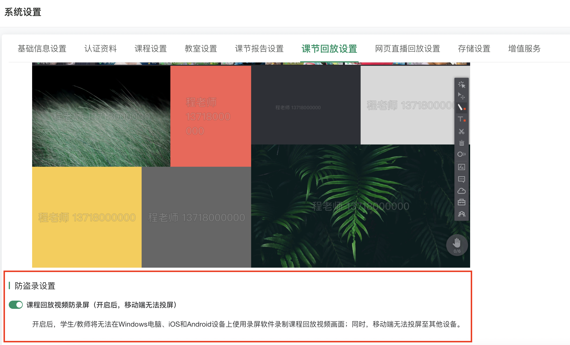 教师在管理后台开启【课程回放防盗录】开关,开启后,用户将无法使用录屏软件录制课程回放视频画面。