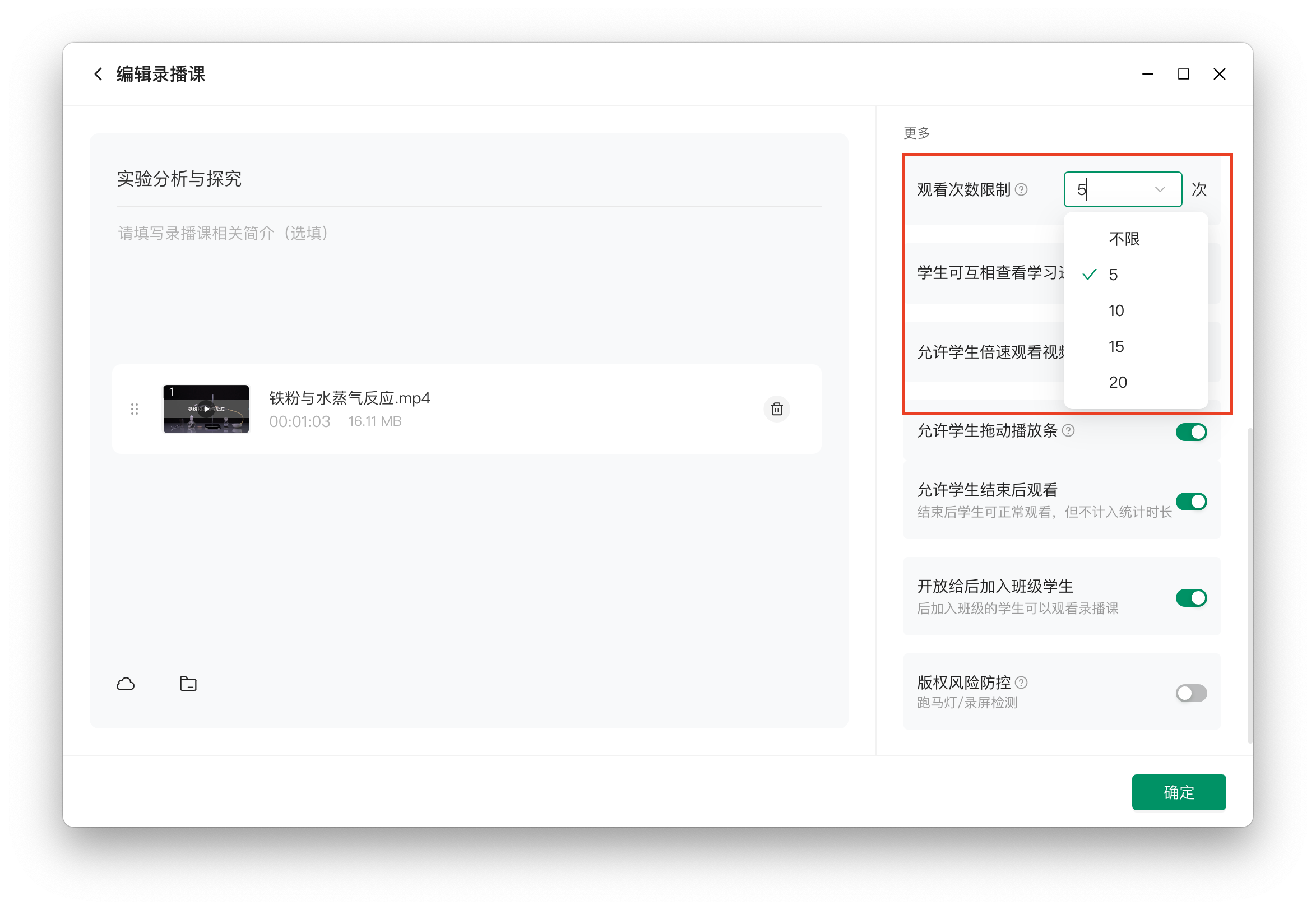 二、 录播课支持设置观看次数