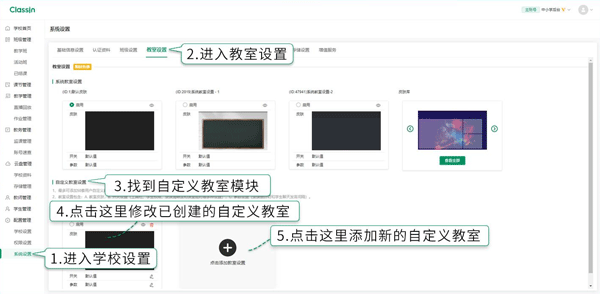 1、在ClassIn软件中进入系统设置界面,然后在教室设置里新建自定义教室或修改已创建好的自定义教室