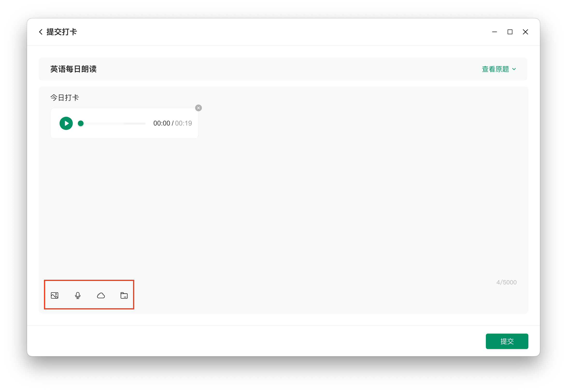 1.2 学生可提交图片、音频、视频等,满足复习打卡、课外阅读、家务劳动及体育锻炼等场景,培养良好的学习习惯;