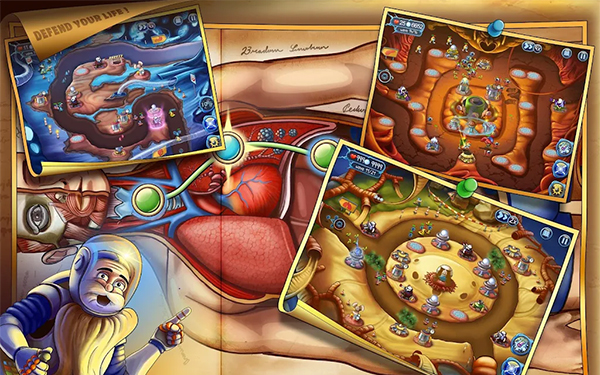 游戏创意真的是不走寻常路,开发商异想天开,居然人体里面修建防御塔,抵御外来细菌和病毒的入侵,你可以想象一下,在嘴巴里安放炮塔,在肺里安放炸弹是个什么样的奇葩场景,游戏虽然创意十足,但是玩法也没有什么值得表扬的地方,和其他塔防类游戏几乎类似,只是换了一个充满科教性质,和创意性的装扮罢了。可以试着玩玩,但是别想它能带给你多大的乐趣,塔防游戏,还是喜欢王国保卫战系列。
