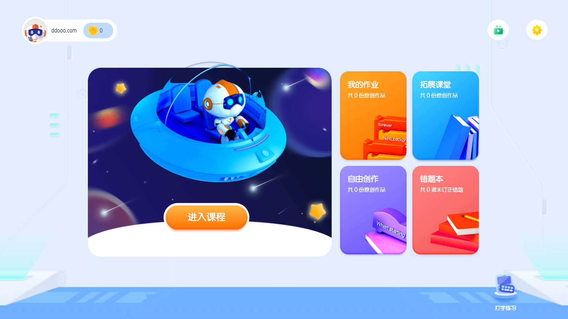 3、如图,进入核桃编程客户端主界面了,包括【进入课程】、【拓展课堂】、【自由创作】、【错题本】和【打字练习】等选项,这里以【自由创作】为例,