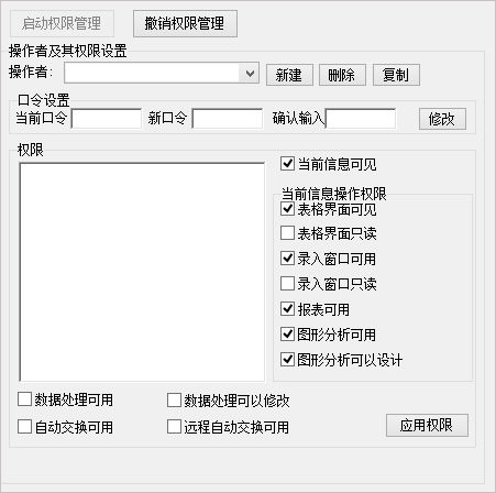 用户可以选择用户权限设置是否启用,如果没有启动权限机制,用户默认以超级用户Admin的身份进入系统。如果启用,用户在登录时就会显示登录窗口,并根据授予的权限确定做相应的操作。只有超级用户才能进行权限设置,可以创建用户和分配权限。也只有超级用户才拥有系统二次开发权限。