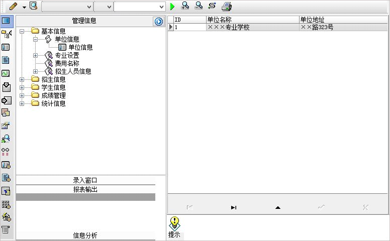 以表格的形式显示信息内容。 表格界面在“信息操作”区中,用表格的方式显示和操作信息. 表格界面的有上方工具栏(表格信息操作工具栏)和左侧工具栏,用来实现信息操作,中间大部分空间均为表格方式显示的信息。