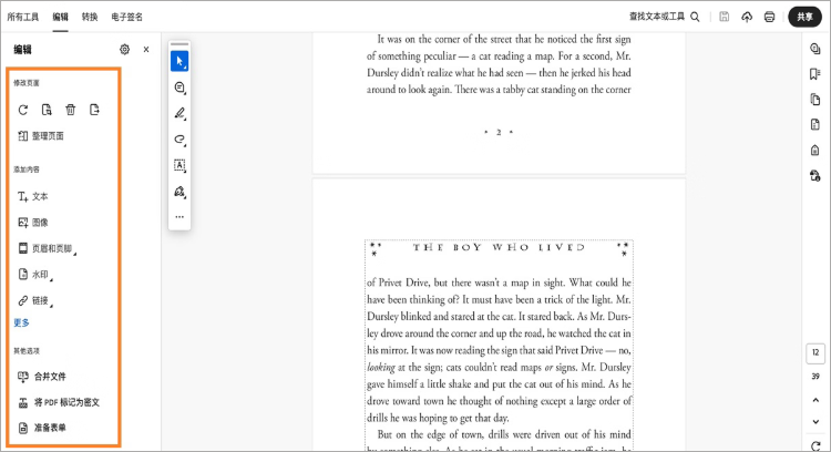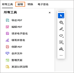 1、在 Acrobat 中打开要编辑的 PDF,然后在全局栏中中选择编辑。