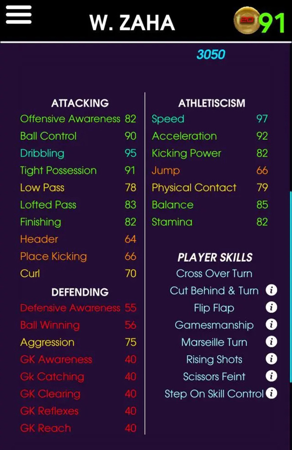 下赛季金球30级总评91,速度高达97唯一的缺点就是射门不行。冬季转会窗口最后一刻,水晶宫与曼联就边锋扎哈转会达成一致,这名黑人边锋永久转会老东家并且签下了5年半合同,根据英国媒体披露,他的转会费为600万镑。