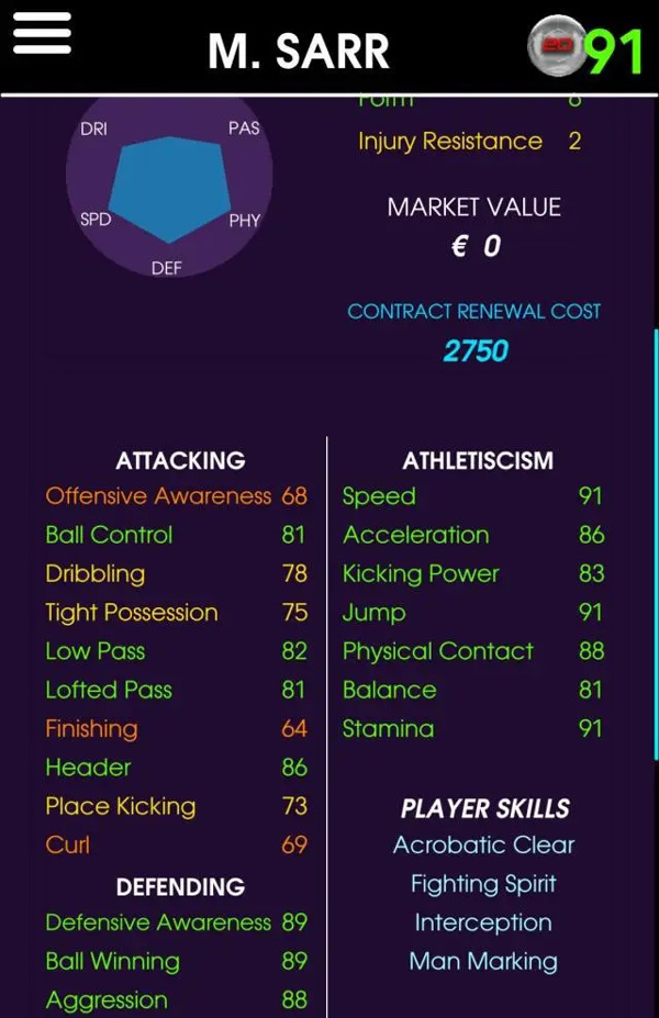 能力方面,有面对控球者时要进行多少程度干扰的”侵略性(Aggression)”,以及细致的球感来避开对手的”控球力(Tight Possession)”。