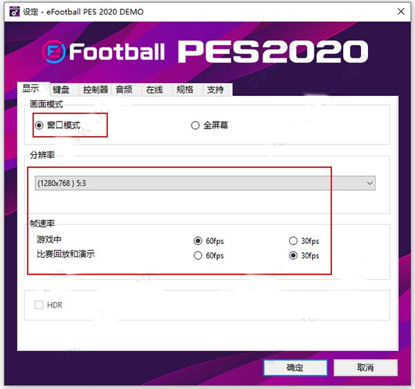 2、双击文件“Settings.exe”进行必要的设置,包括是采用全屏或窗口模式,为了演示方便,小编选择窗口模式,分辨率为1280*768,帧速率为游戏60fps,比赛回放和演示30fps;