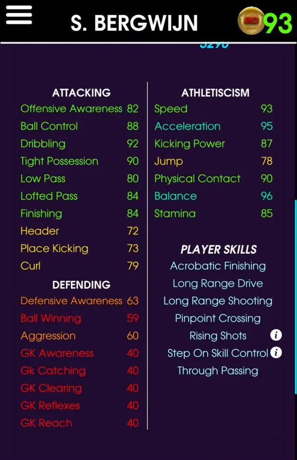 身体接触90、平衡96这数据是不是很恐怖? 1997出生的他现效力于荷甲的埃因霍温足球俱乐部,2017年9月19日,入选2017年金童奖候选名单。博格维因与生俱来的速度和爆发力会让人一眼就能在球场上记住他,被称作下一个德佩的他同样是右脚,并且踢得最多的位置也是左边锋,此外他还能踢中锋。而他的盘带和射门能力也得到了球探们的认可,有些媒体也把他的上限写成了罗本这一个级别,让我们拭目以待吧。