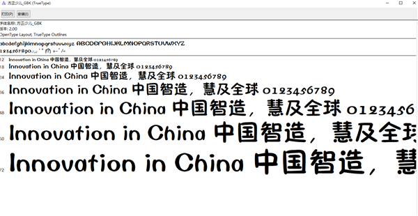 方正少儿_gbk是一款应用于设计方面的中文简体汉字,该字体端正大方,粗细适中,并且整体效果非常出色,能够适用于广告设计、名片设计、包装印刷、产品设计等应用。而且,这款字体非常的有个性,比起您使用的传统默认的字体来说显示的更加饱满,每一个字都是设计师精心设计出来的,而且笔锋的走向也是非常的有力,字体结构十分端正,笔法十分的流畅且飘逸,让用户在使用当中有耳目一新的感觉,使用起来也是可以给用户的电脑增添一笔活力,让您的电脑更具一番色彩。