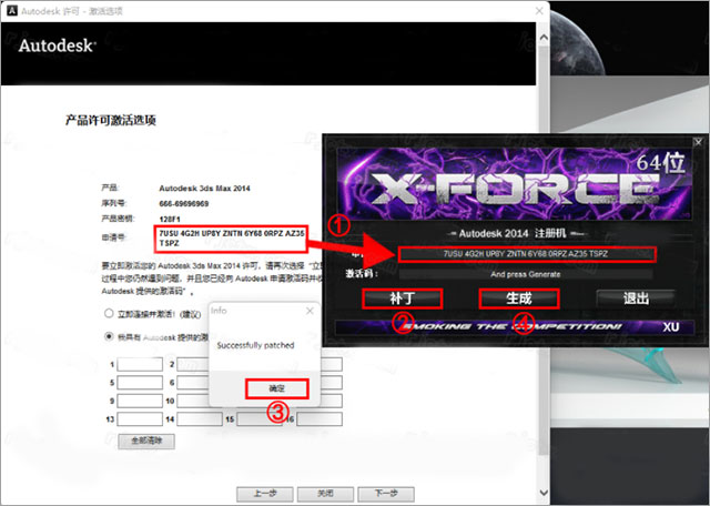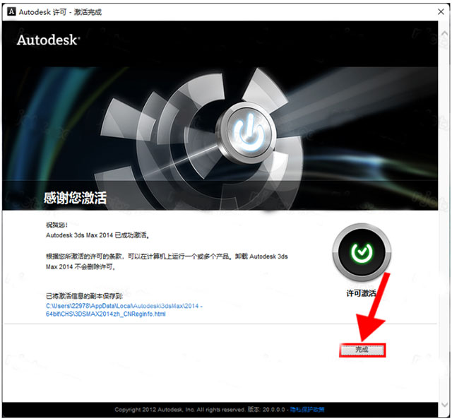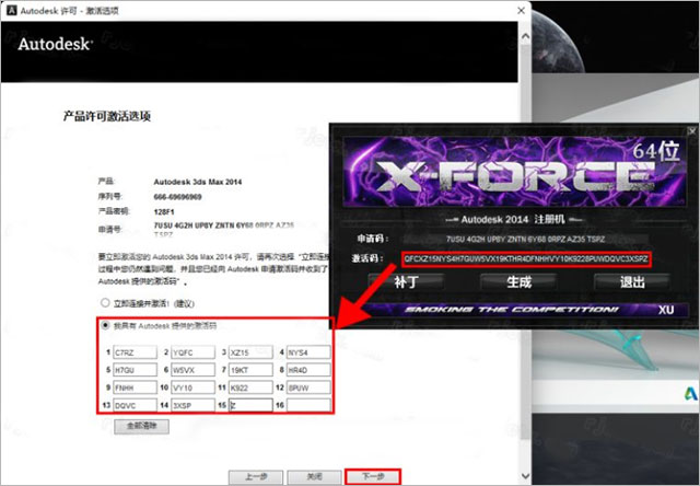 8、现在就可以复制激活码到激活界面,并点击下一步。这样就完成了Autodesk产品的注册了。
