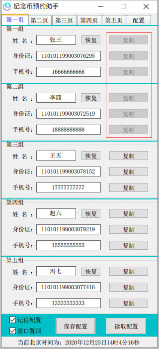 4、避免重复复制同一数据出现名字、身份证号错误的情况,点击复制过后该按钮自动禁止,点击恢复即可再次复制;