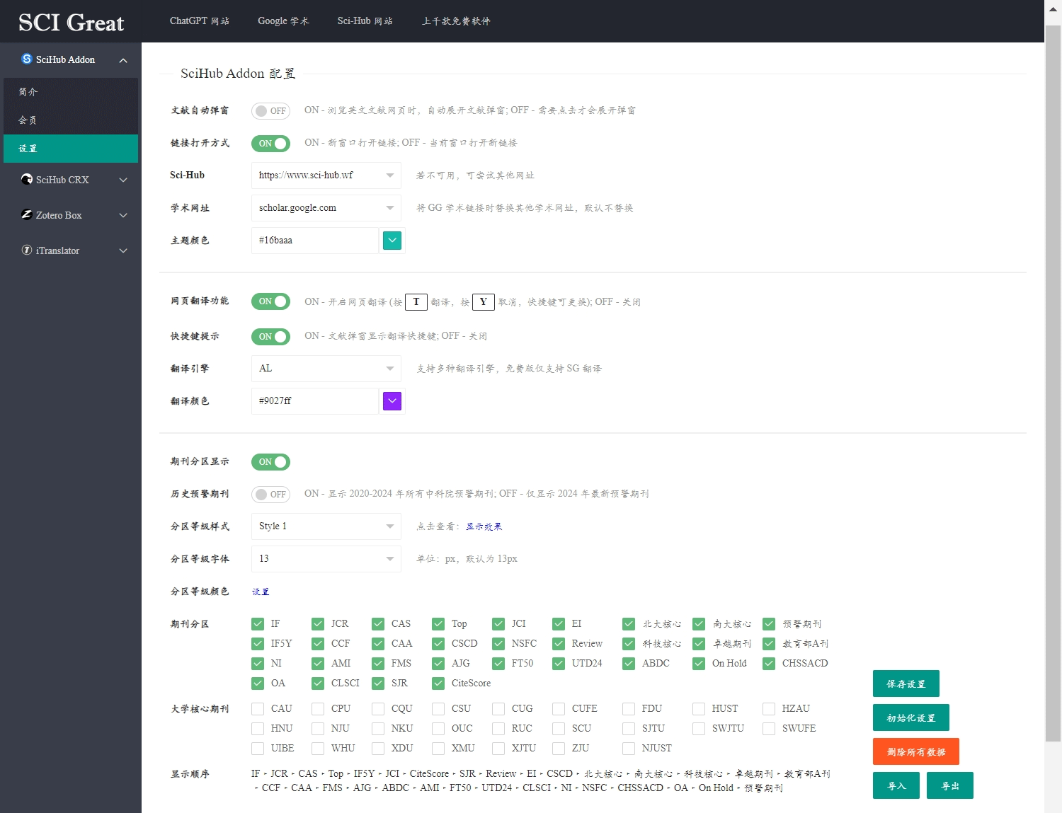 4、插件设置,可以选择 显示期刊等级信息、翻译功能、翻译引擎、翻译快捷键、Sci-Hub 网址、Libgen 网址、新网页打开方式以及等级显示样式、主题颜色、翻译字体颜色、自定义数据集显示顺序等。