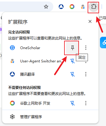 2、如果工具栏不显示 OneScholar 图标,可以按着下面的方法设置一下,将 OneScholar 图标固定在工具栏上