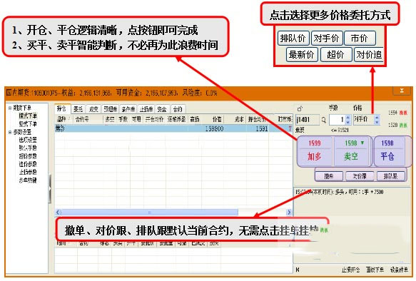 智能交易,多种委托价格形式,大键开平,让下单更科学更速度,适用于日内波段交易者。