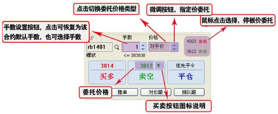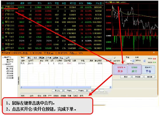 操作方法:左键点击报价列表或分析图表中选择要交易的合约,交易界面的“合约号”将自动变为该合约、手数为默认下单手数,“买多”和“卖空”按钮上将出现对应的下单价格,点击“买多”或“卖空”按钮即可进行开仓下单。