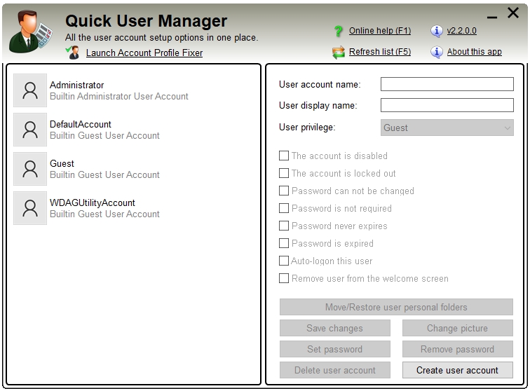 3、您还可以设置与用户帐户关联的图片、设置或删除其密码、删除和创建用户帐户。该工具的最新版本还包括Account Profile Fixer、它可以帮助您修复损坏的用户帐户上的问题。