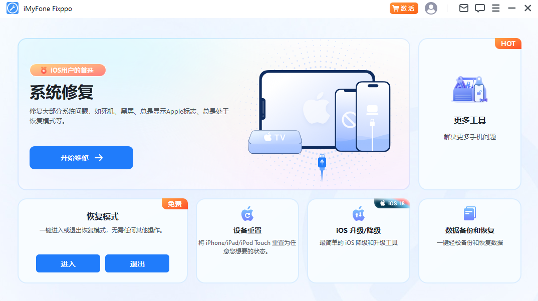 借助疯师傅苹果修复大师,您只需单击一下即可使您的iPhone/iPad/iPod touch进入/退出恢复模式,且不会丢失数据。