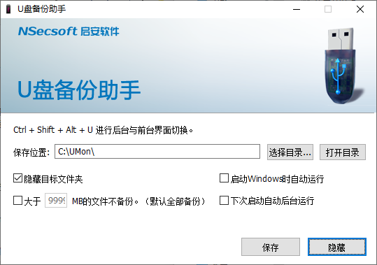 将程序UMon.exe放在U盘上你想备份的目录中(如果需要备份整个U盘,可将ubackup.exe放在U盘的根目录),执行U盘上的UMon.exe程序,设置“输出目录”和“排除目录”,点击按钮“备份”,文件会备份在“输出目录”中,同时“输出目录”的多余文件会自动删除。