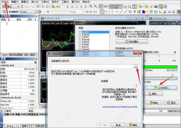 2、安装好后即可开始导入股票数据,点击“文件”→“数据中心”→“从文件导入”→点击箭头指向,选择刚才下载后解压出来的txt数据(以欧元为例),点击ok键就可以;