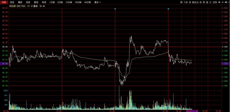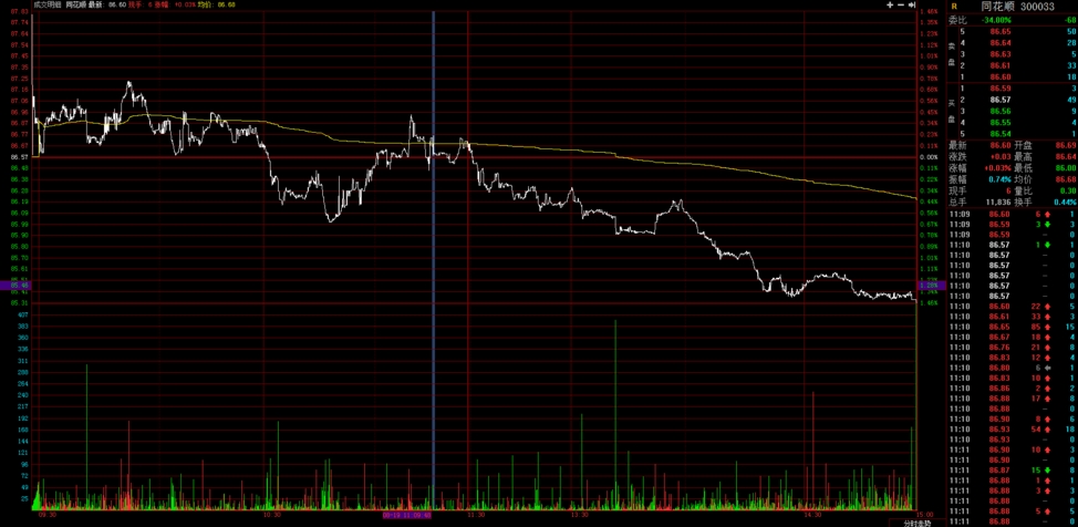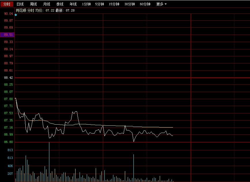 分时走势一般由三要素组成,分时价格线、分时均价线和成交量,其中黄色的分时均价线是一个比较重要的参考指标,一般以股价是否站上这根均线作为强弱的分水岭。