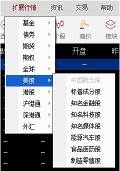 提供美股的行情报价,为方便查看,分为中国概念股、标普成分股、知名金融股、知名科技股等八个分类。点击“扩展行情”里的“美股”即可进入。