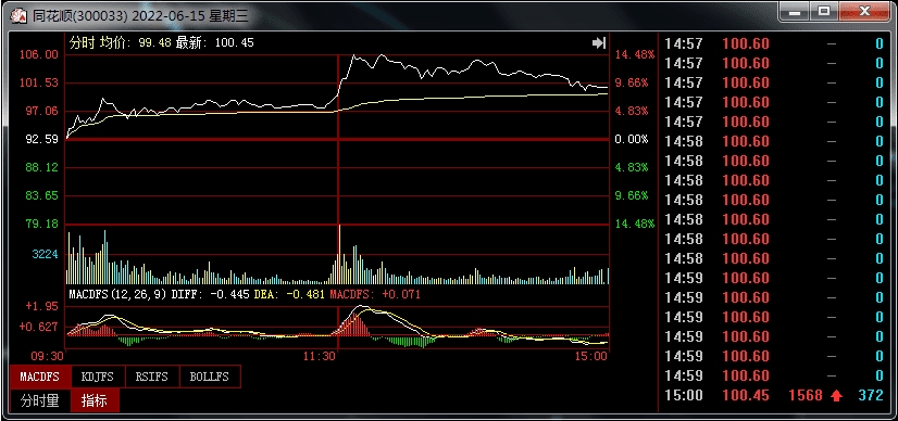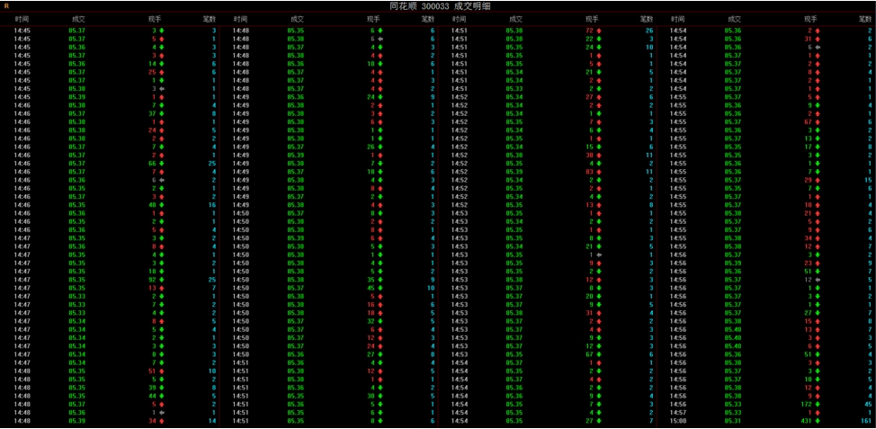 成交明细:提供逐笔成交与分时成交明细表。在个股分时走势页面里按“F1”或“01+enter”,都可以切换到成交明细表。在这里您可以看到当天按时间次序排列的每一笔成交的时间、价格,当时买入价、卖出价、成交手数。