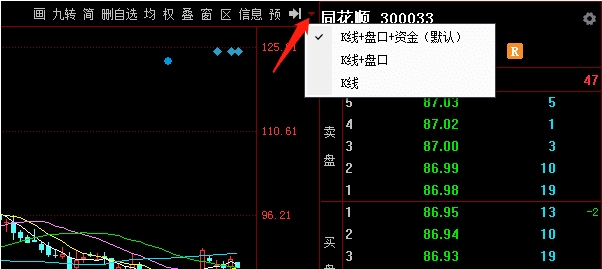同时分时走势共提供了三种页面布局,分别是K线+盘口+资金、K线+盘口、K线,用户可以根据自己的喜好选择。例如默认K线+盘口+资金如下图: