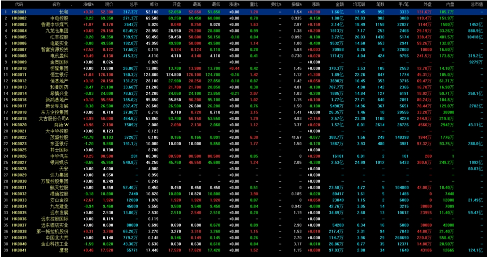 点击菜单中的“扩展行情”里的港股进入。其中,按快捷键9可以进入所有港股的报价界面,按19进入AH股列表,可以了解最新的AH股折溢价的情况。